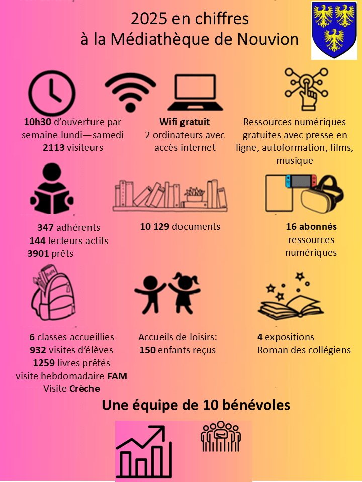 Vous pouvez emprunter gratuitement livres, BD, CD…achetés par la ville de Nouvion ou prêtés par la Bibliothèque de Somme http://www.bibliotheque.somme.fr/ sur commande