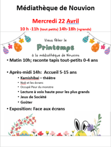 Mercredi 22 avril matin 10h raconte tapis pour les petits 0-4 ans après-midi Contes et lectures pour les plus grands Jeux de société Goûter